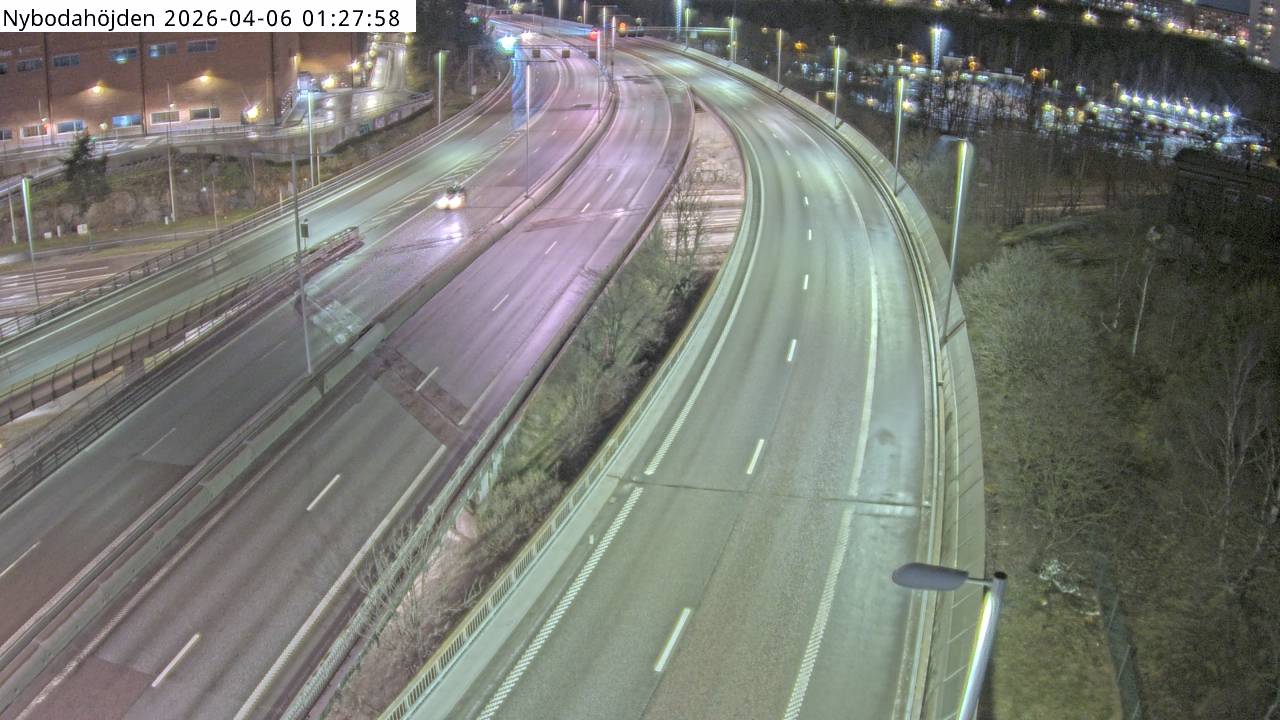 Nybodahöjden — Kameran är placerad på E4/E20 Essingeleden i trafikplats Nyboda (Nybodakurvan) och är riktad mot Uppsala. Trafik i mitten av bilden är på väg till respektive från Södra länken.